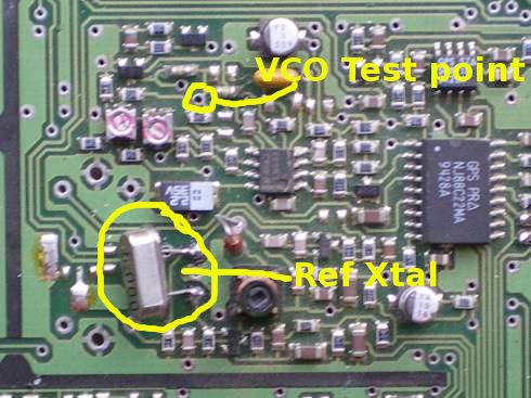 7. Measure the RX VCO frequency (after the buffer) and adjust the slug near the reference crystal to a freq of 129.4Mhz (photo 6)