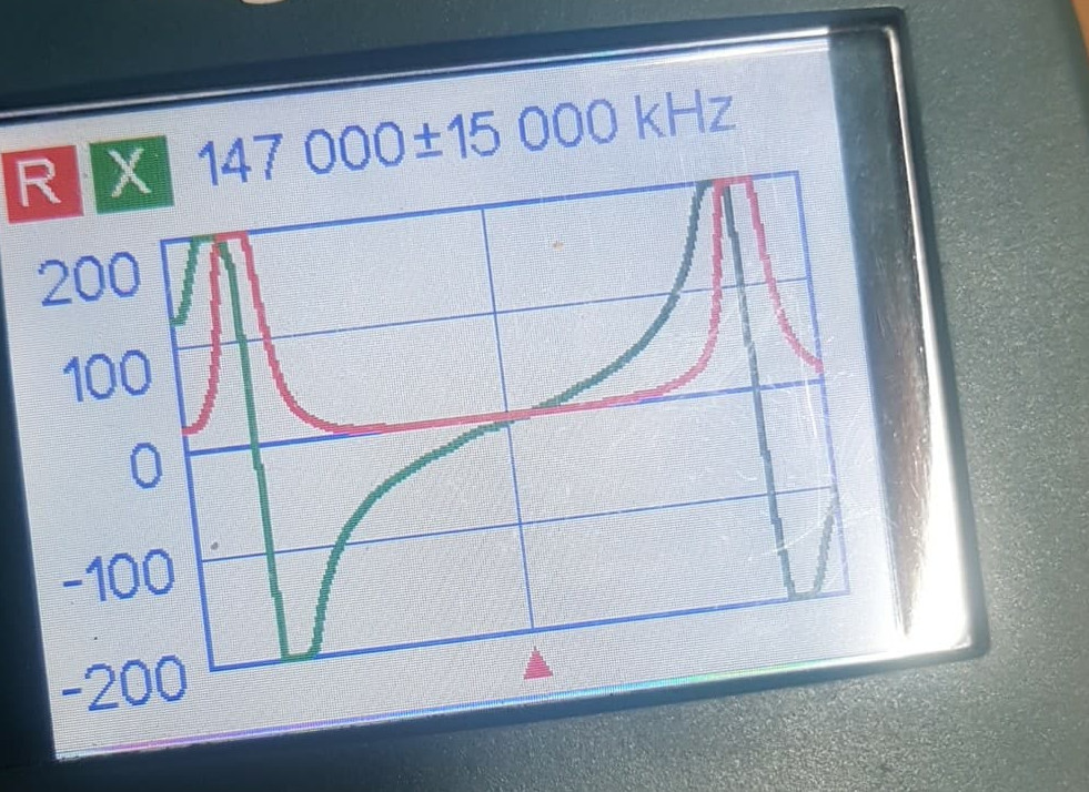 Fortunately, the folded dipole I cut up had a piece around 700mm long. Instead of just cutting to maths, I have the fortunate pleasure of using an AA-1000 antenna analyser. With this I put the stub onto the analyser, and using the resistance (R) and reactance (X) graph, I was able to shorten the stub until the R and X crossed paths. This was the optimum length