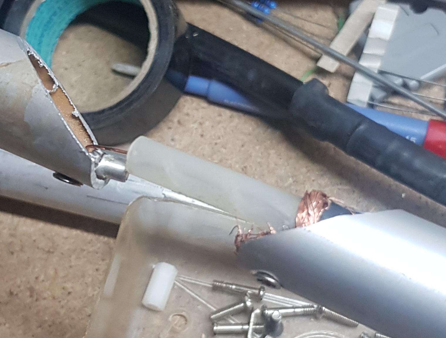 So after finding the correct length, I had to thread it back into the dipole and attach the braid to the top element and the centre conductor to the bottom element