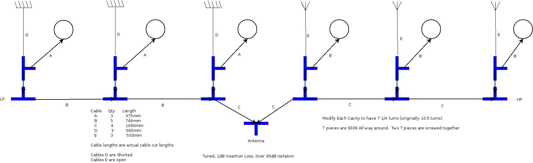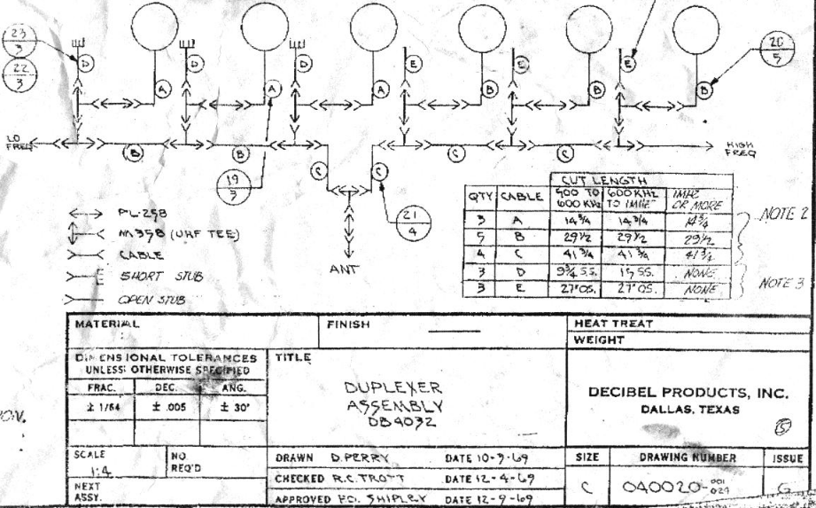 The DB4032 cavities I have came as a 35 – 40Mhz set. They are suited to a separation down to 500khz, with 2dB insertion loss. At 500khz, the isolation is stated to be 80dB. As received, the cavities were set up for 2 transmitters and one receiver into one antenna, and it was missing some coax. Finding an old photo of what the interconnect cables are supposed to be for a full duplex duplexer I re-arranged the cavities to suit. See Image 3. Drawn in 1969…..
