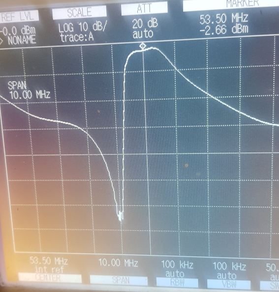 After a lot of trial and error, I ended up with a cavity that showed similar “Q” to the original design, AND was centred at 53.750 for the high pass, and 52.750 for the low pass. I ended up removing 3 ¼ turns from the helical coils in the cavity (giving me 7 ¼ turns), and ended up with Coax Stubs between 500 and 550mm long. With the pathetic leads I was using to test the cavities (some old rg58) with the right ends already on them, I had just on 1 dB of loss through them. I Could have zero'd out the analyser to compensate, however, it was fine for what I was wanting to see.