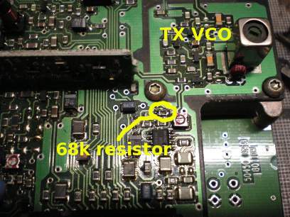 11. Adjust the deviation on the control board to 5khz. (photo 11). If you cannot get enough deviation you will need to change the 68k resistor near the modulation balance trimpot to 22k. Ref photo 12. Dion, VK7DB informs me that there is some caps in paralell on the Audio path to the TX VCO. If you remove the first one you come to it drops the capacitance from 33p to 15p and he got 11khz of deviation out of the radio. I will look into the circuit diagram and circle the appropriate cap. He also had to play with the modulation balance after removing this cap. I have also thought about adding another varicap diode to the existing varicap on the Audio path in the TX VCO. I have not played with this however.